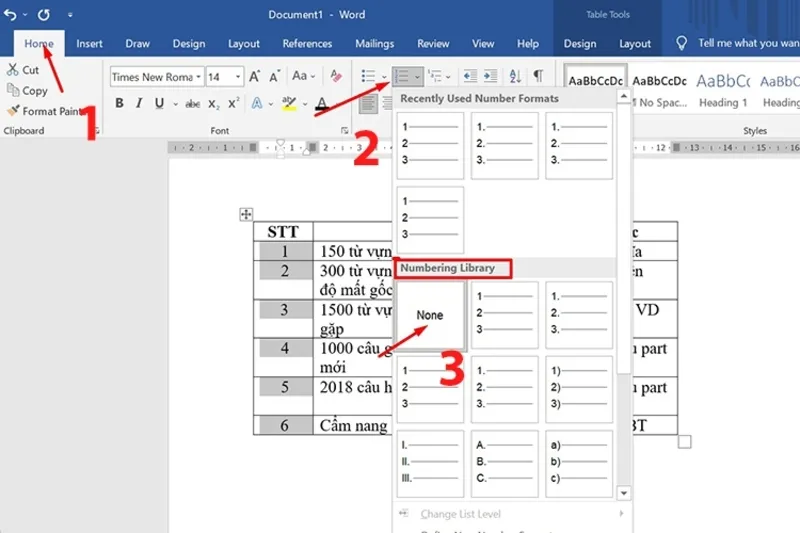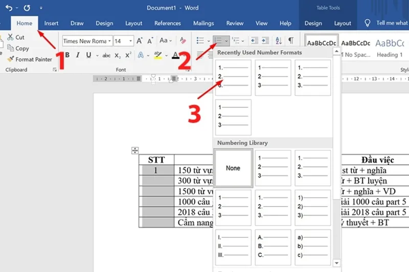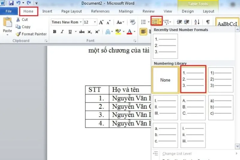 Cách đánh số thứ tự trong bảng Microsoft Word