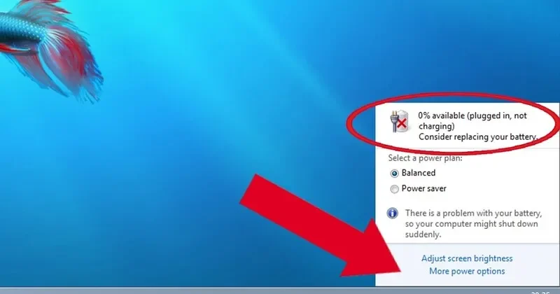 Dấu hiệu điển hình nhất chính là sự xuất hiện của một dấu “X” màu đỏ nằm đè lên biểu tượng viên pin ở góc phải màn hình. Khi bạn di chuyển con trỏ chuột vào biểu tượng này, một dòng thông báo đầy đủ sẽ hiện ra yêu cầu bạn nên xem xét việc thay thế pin mới.