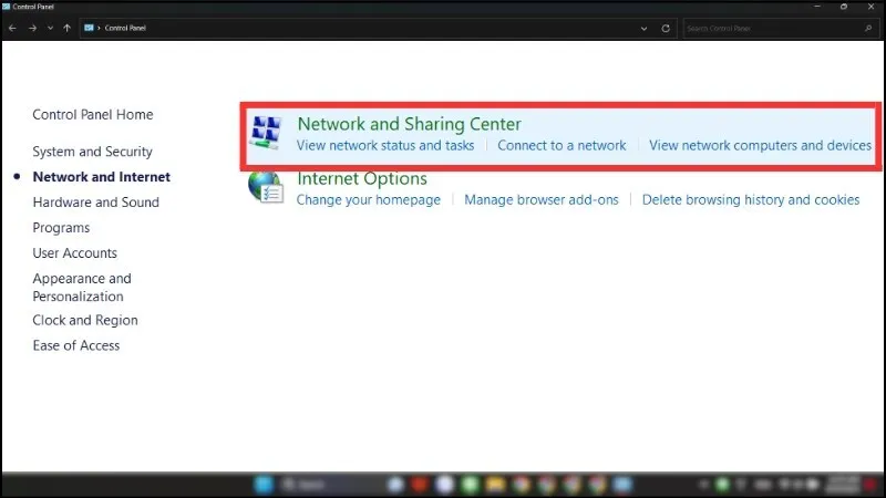 Một cách khác là vào Start, nhập Control Panel, tìm đến mục Network and Internet rồi chọn Network and Sharing Center.
